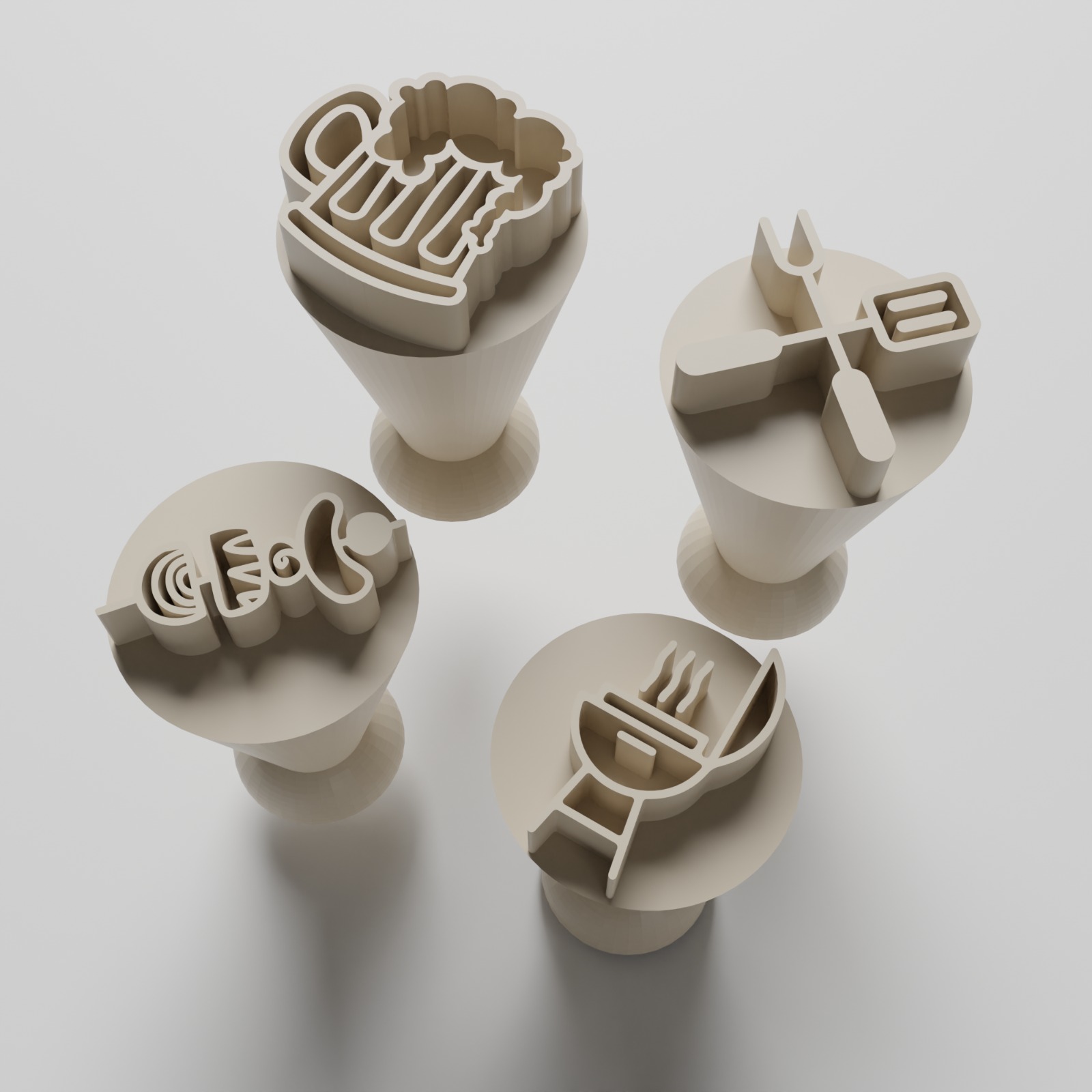 Contém: 4 Carimbos (copo, churrasqueira, espeto, garfo)