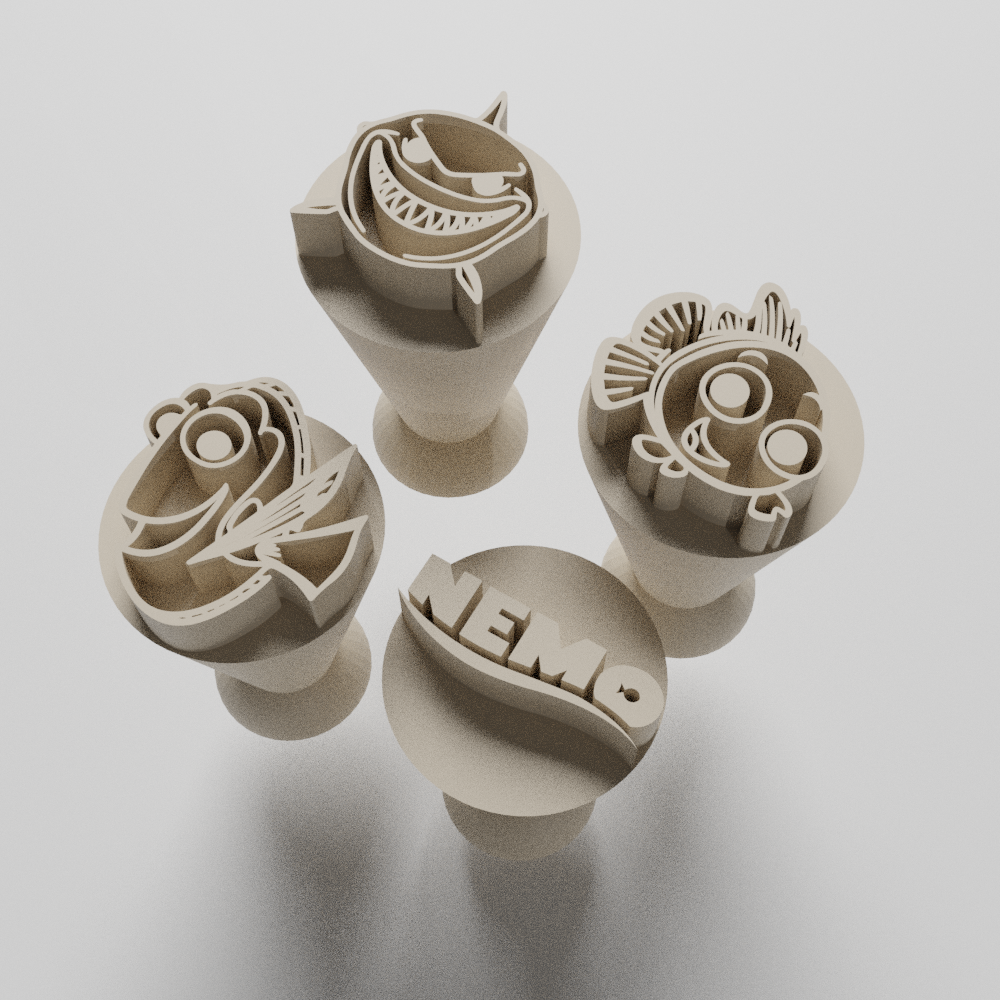 Contém: 4 Carimbos (Nemo, Dory, tubarão e logo)