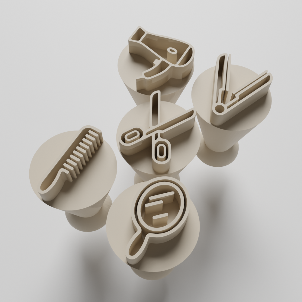 Contém: 5 Carimbos (Chapinha, espelho, pente, secador e tesoura)