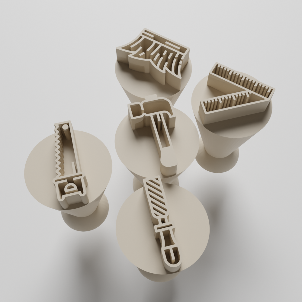 Contém: 5 Carimbos (Lima, madeira, martelo, régua e serrote)