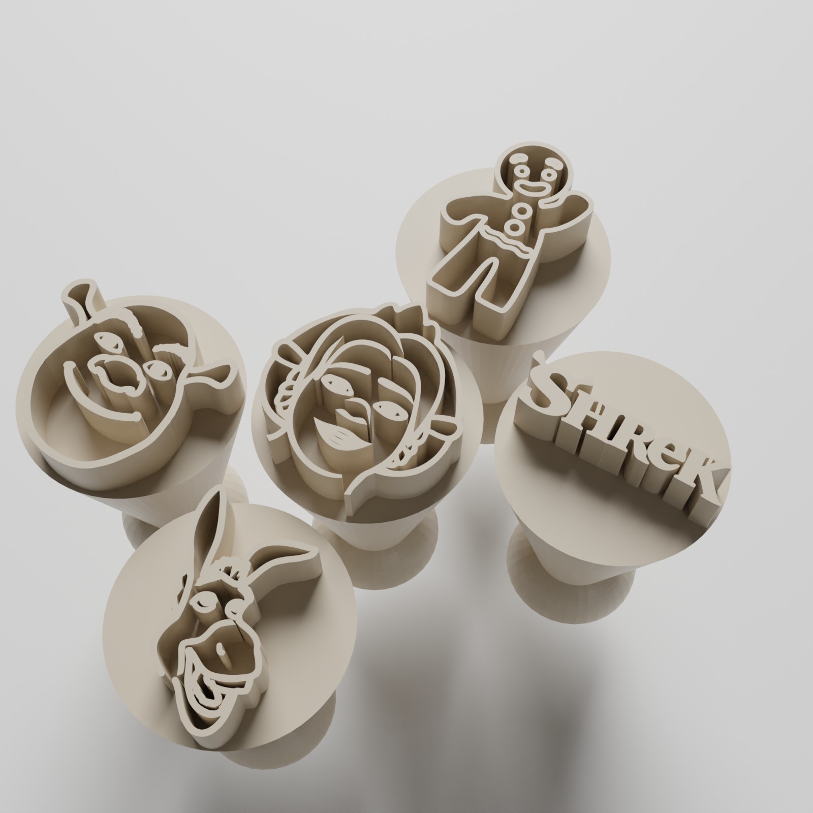Contém: 5 carimbos (Logo Shrek, Shrek, Fiona, burro e biscoito)