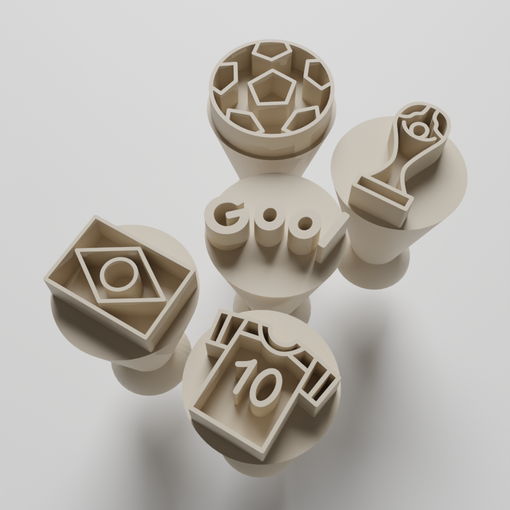 Contém: 5 Carimbos (Bandeira, bola, camiseta, troféu e escrita Gol)