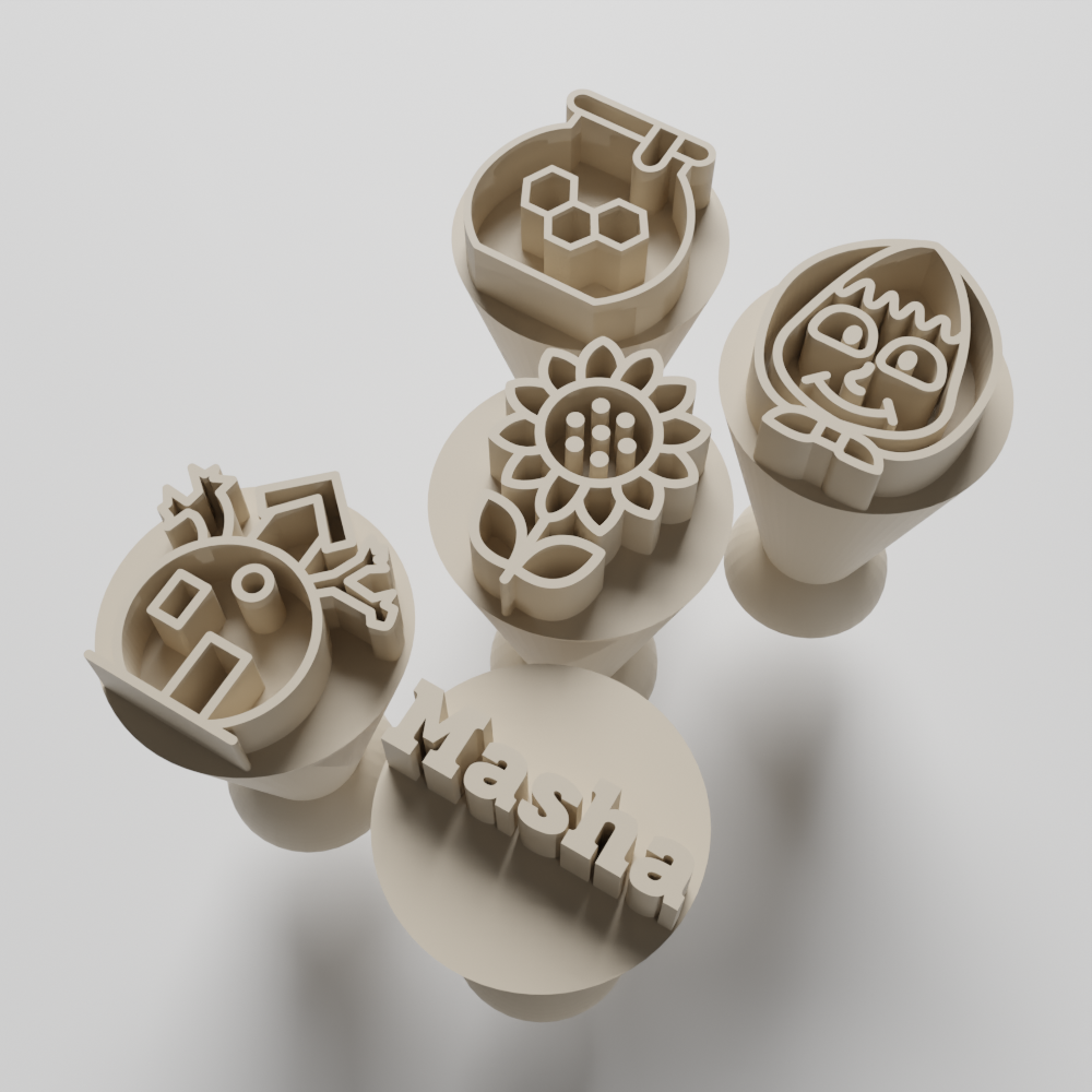 Contém: 5 carimbos (Masha, casa, escrita, girassol e pote de mel)