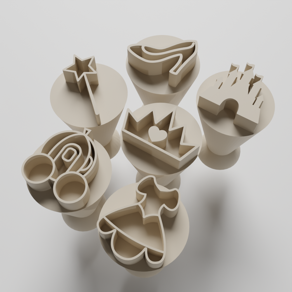 Contém: 6 Carimbos (Vestido, varinha, coroa, castelo, sapado e carruagem)